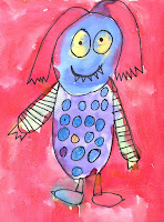 3. Distribute watercolor paint that is made from tablets that have been dissolved in spill-proof cups. Ask the students to paint in all the shapes they have drawn, including the background. This monster was created by a 1st grader.